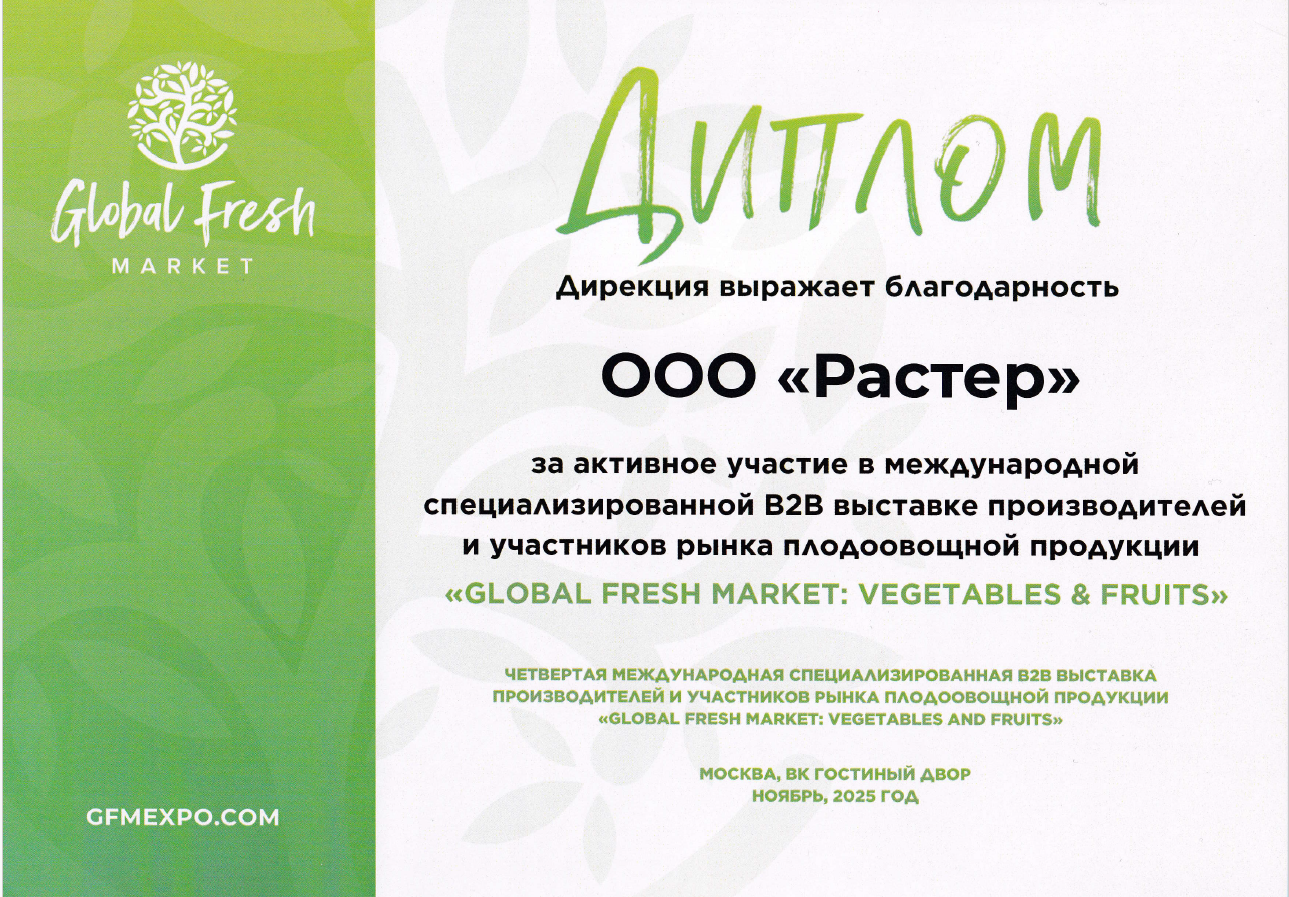Мы приняли участие в международной специализированной B2B-выставке Global Fresh Market: Vegetables & Fruits, которая прошла в Москве в ВК «Гостиный двор» с 11 по 13 ноября. Мероприятие стало продуктивной и познавательной профессиональной площадкой. В рамках выставки была представлена насыщенная деловая программа, включающая пленарные заседания, круглые столы, отраслевые сессии и тематические семинары, посвящённые актуальным вопросам развития рынка свежей продукции. Выставка традиционно объединяет ключевые звенья цепочки от сельскохозяйственного производства до логистики и ритейла, представляя новейшие технологии, решения и продукты отрасли.